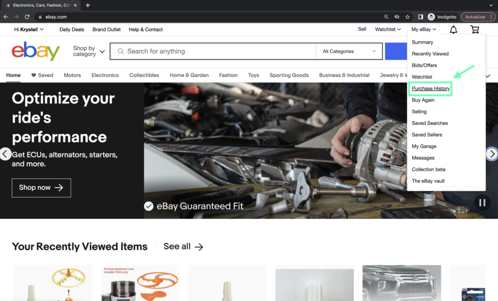 - En el menú desplegado, ingresa a ‘Purchase History’